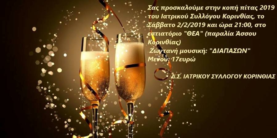 Σας προσκαλούμε στην κοπή πρωτοχρονιάτικης πίτας 2020 του Ιατρικού Συλλόγου Κορινθίας, το Σάββατο 8/2/2020 και ώρα 21:00, στο εστιατόριο «Θέα» (παραλία Άσσου Κορινθίας). Ζωντανή Μουσική: «ΔΙΑΠΑΣΩΝ» Έναν χρόνο μετά την πολύ επιτυχημένη μας εκδήλωση, καλούμαστε να επαναλάβουμε το ίδιο και φέτος. Η εκδήλωση συνδιοργανώνεται με τον Φαρμακευτικό Σύλλογο Κορινθίας, γεγονός... Continue reading