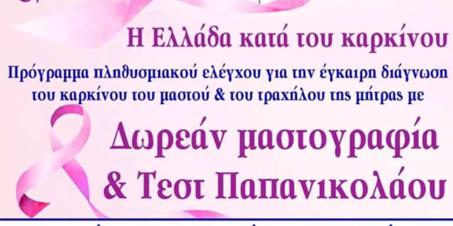 Ο Ιατρικός Σύλλογος Κορινθίας στηρίζει και ΘΑ ΣΤΗΡΙΖΕΙ κάθε δράση που αφορά τη πρόληψη του γενικού πληθυσμού! Οι γυναίκες "πάντα" πρώτα!!! Στα πλαίσια του προγράμματος "Η Ελλάδα Κατα του Καρκίνου", το Ελληνικό Ίδρυμα Ογκολογίας με τη στήριξη, πρωτίστως, του Ιατρικού Συλλόγου Κορινθίας, θα διενεργεί για τις επόμενες εβδομάδες στον νόμο... Continue reading